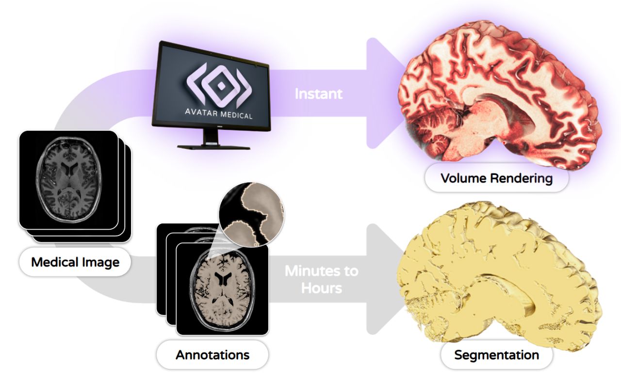 Segmentation: This involves pixel-by-pixel labeling of anatomy by hand or by algorithm. By hand, the process is laborious and subject to the annotator’s biases. By algorithm, there is no assurance that results are 100% accurate. Medical images are as diverse as patients; no algorithm can fully capture this. The typical result of a segmentation is a frozen plastic-like surface that permits measurement and quantification, but is not primed for faithful understanding of real anatomy.